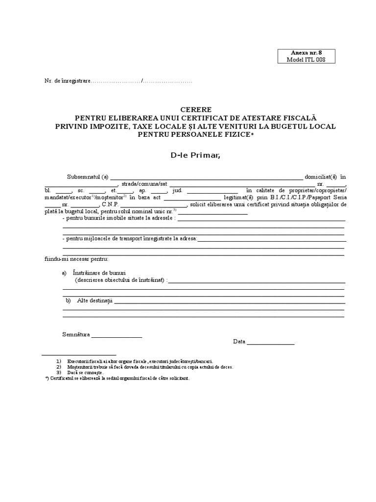Subsemnatul(a)/persoana juridica__n_u_m_e_c_u_m anexez urm toarele documente: Cerere pentru eliberarea certificatului privind atestarea impozitului plătit în românia de persoane fizice nerezidente omfp 724 2011 application for the issuance of the certificate attesting. Cererea pentru scoaterea persoanelor de la întretinere se adresează presedintelui asociației de proprietari care în urma solicitării are obligația de a scoate persoanele respective de la cheltueli.